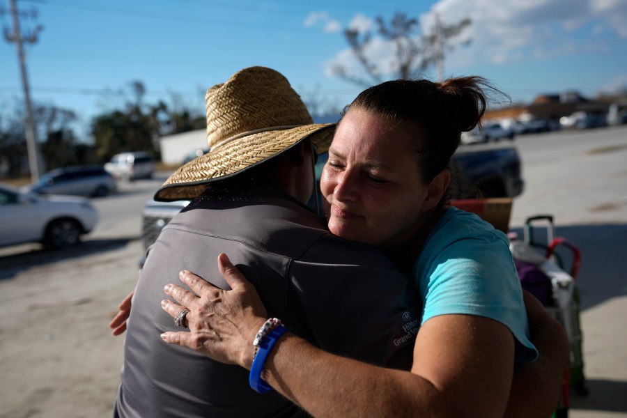 Heide Haydu hugs a friend as they part ways after evacuating from Estero Island in Fort Myers Beach, Fla., Saturday, Oct. 1, 2022, three days after Hurricane Ian bore down on the barrier island. Haydu lives in the region and was staying at a beachfront resort with her husband on Estero Island when the storm hit. (AP Photo/Rebecca Blackwell)
