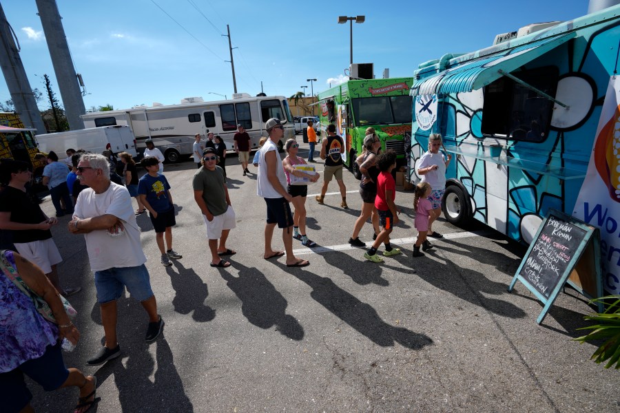 People line up to receive a hot meal from popular Miami food trucks brought in by the non-profit World Central Kitchen, which funds locally-sourced hot meals for people in disaster zones, in Cape Coral, Fla., Saturday, Oct. 1, 2022, three days after the passage of Hurricane Ian. (AP Photo/Rebecca Blackwell)