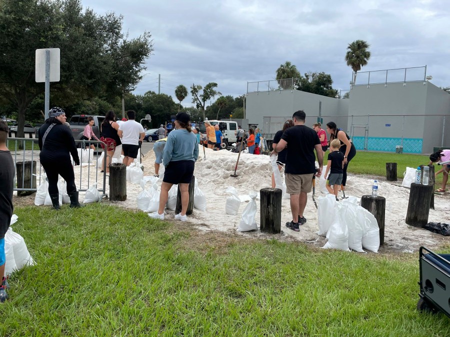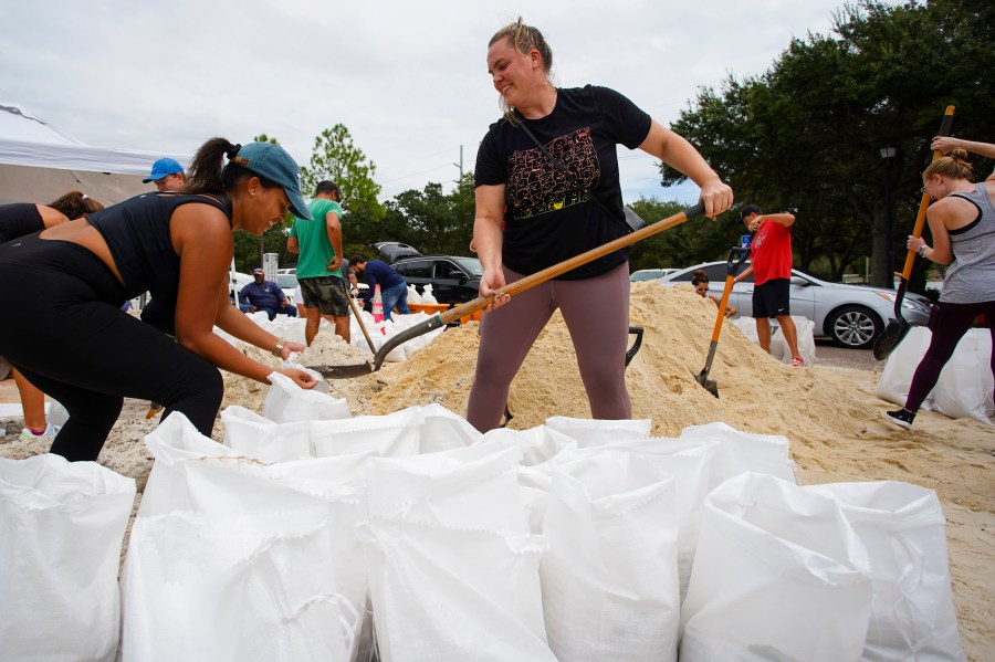 People make sandbags at MacFarlane Park, one of the city of Tampa’s three sandbag sites, Sunday, Sept. 25, 2022, in Tampa, Fla. (Luis Santana/Tampa Bay Times via AP)