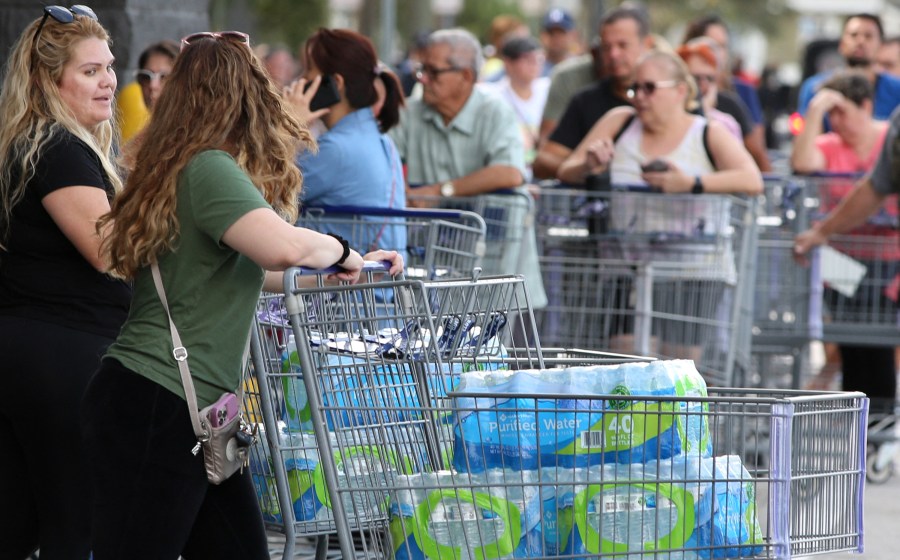 A long line of shoppers are seen past a person pushing cases of water outside a retail warehouse as people rush to prepare for Tropical Storm Ian, in Kissimmee, Florida, on September 25, 2022. – Tropical storm Ian is forecast to “rapidly intensify” over the weekend and become a major hurricane as it moves toward Florida, according to the US National Hurricane Center. (Photo by Gregg Newton / AFP) (Photo by GREGG NEWTON/AFP via Getty Images)