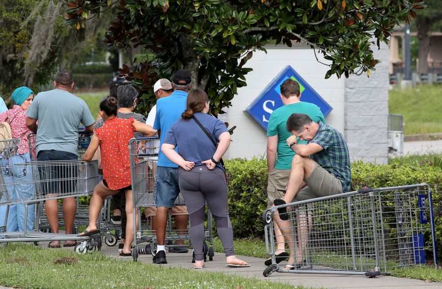 Shoppers wait in a line stretching beyond the parking lot outside a retail warehouse as people rush to prepare for Tropical Storm Ian, in Kissimmee, Florida, on September 25, 2022. – Tropical storm Ian is forecast to “rapidly intensify” over the weekend and become a major hurricane as it moves toward Florida, according to the US National Hurricane Center. (Photo by Gregg Newton / AFP) (Photo by GREGG NEWTON/AFP via Getty Images)
