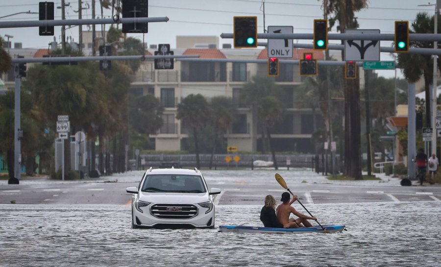 People kayak past an abandon vehicle in the intersection of Boca Ciega Drive and Pasadena Avenue Wednesday, Aug. 30, 2023 in St. Pete Beach, Fla., Hurricane Idalia made landfall Wednesday in Florida as a Category 3 storm and unleashed devastation along a wide stretch of the Gulf Coast, submerging homes and vehicles, turning streets into rivers, unmooring small boats and downing power lines in an area that has never before received such a pummeling. (Chris Urso/Tampa Bay Times via AP)
