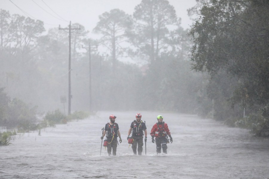Rescue workers with Tidewater Disaster Response wade through a tidal surge on SW 358 Highway while looking for people in need of help after the Steinhatchee River flooded on Wednesday, Aug 30, 2023, in Steinhatchee, Fla., following the arrival of Hurricane Idalia. (Douglas R. Clifford/Tampa Bay Times via AP)