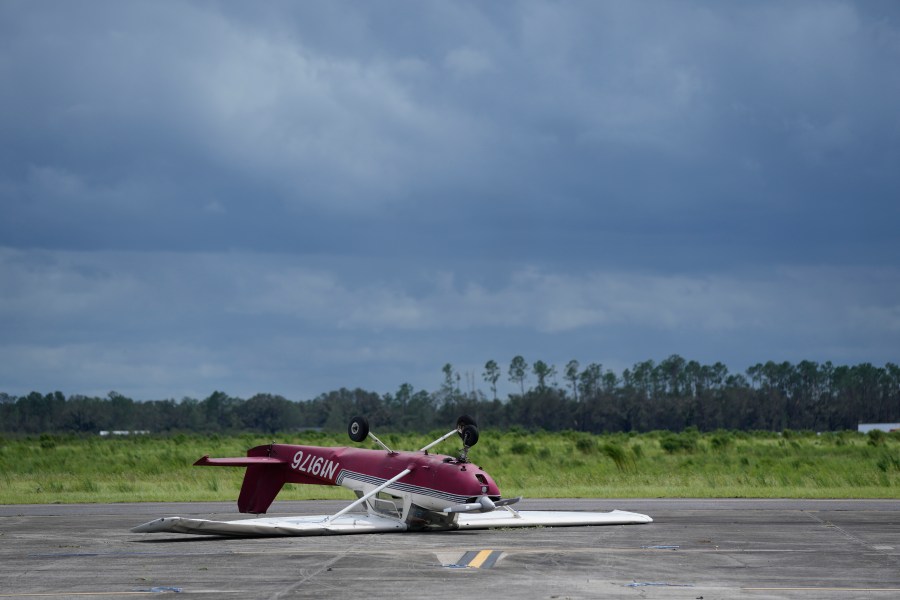 A small plane lies upside down on the tarmac at Perry-Foley Airport, following the passage of Hurricane Idalia, Wednesday, Aug. 30, 2023, in Perry, Fla. (AP Photo/Rebecca Blackwell)