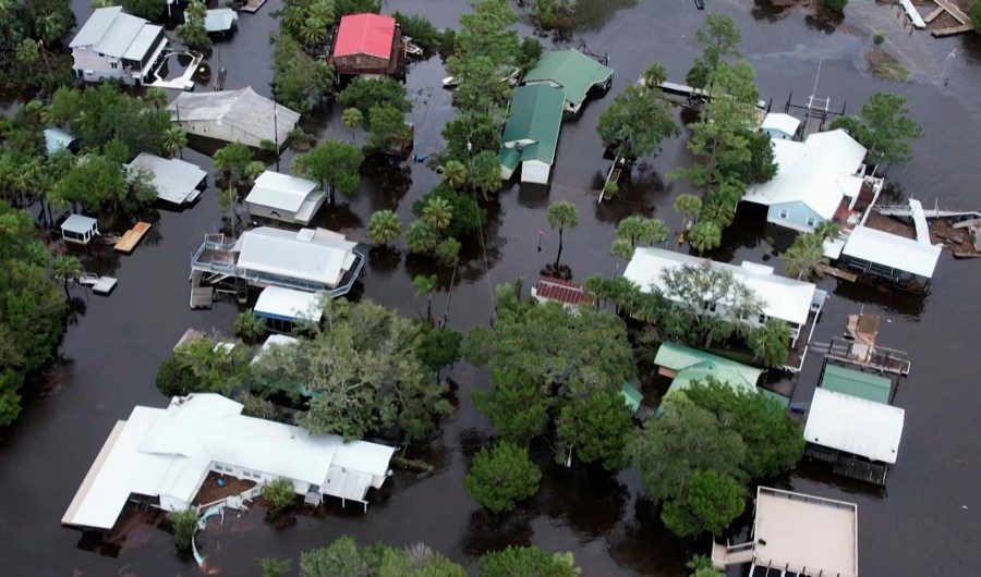 This aerial photo shows homes surrounded by floodwaters in Steinhatchee, Fla., Wednesday, Aug. 30, 2023, left behind by Hurricane Idalia. (AP Photo/Daniel Kozin)