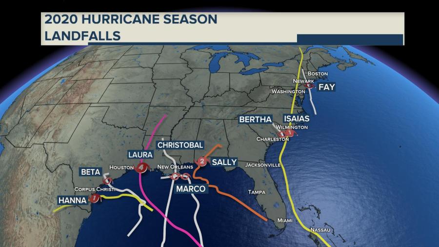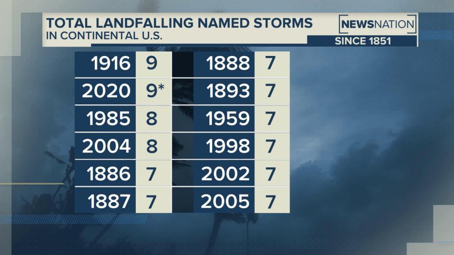 The 2020 hurricane season is still on pace to be a record breaker for most named storms in a season and is tied for first place with 1916 for the most landfalling named storms in the continental US at 9.