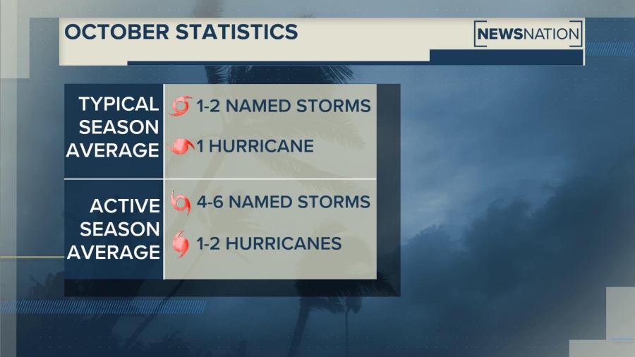 When averaging the most active hurricane seasons, the month of October saw 4-6 named storms with 1-2 becoming hurricanes.