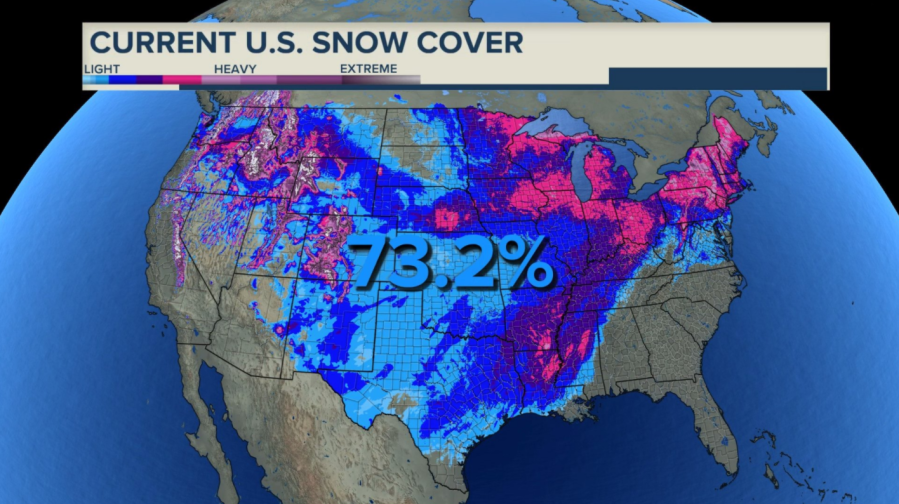 Satellite images Tuesday afternoon showed there was snow on the ground for about 73% of the U.S., setting an all time-record since they started keeping track back in 2003. The previous record was in January of 2011, when 70.9% of the country was covered.