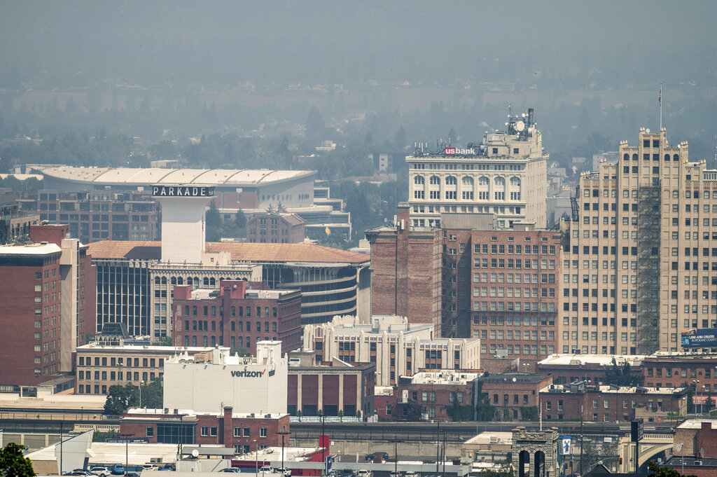 Smoke from area wildfires blankets downtown Spokane, Wash, Saturday, July 10, 2021. (Colin Mulvany/The Spokesman-Review via AP)
