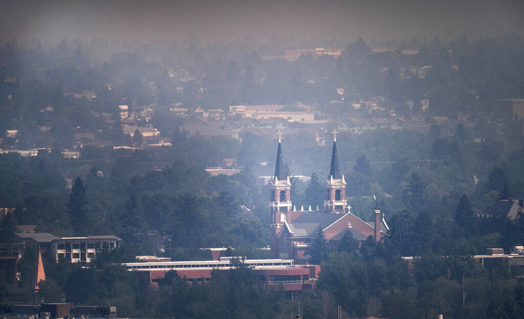 St. Aloysius Church on the campus of Gonzaga University is blanketed in smoke from area wildfires, Saturday, July 10, 2021. (Colin Mulvany/The Spokesman-Review via AP)