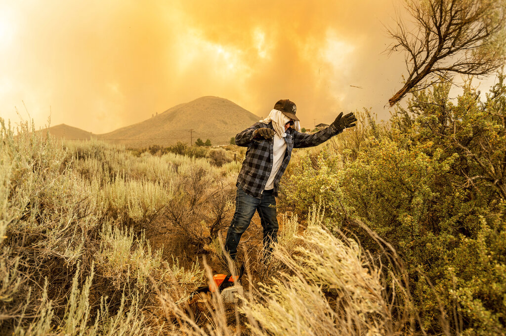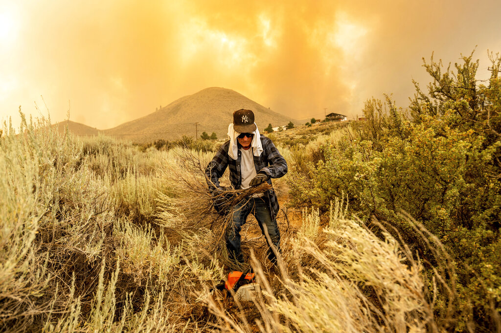 David Garfield clears a fire break around his home as the Sugar Fire, part of the Beckwourth Complex Fire, burns towards Doyle, Calif., on Saturday, July 10, 2021. (AP Photo/Noah Berger)
