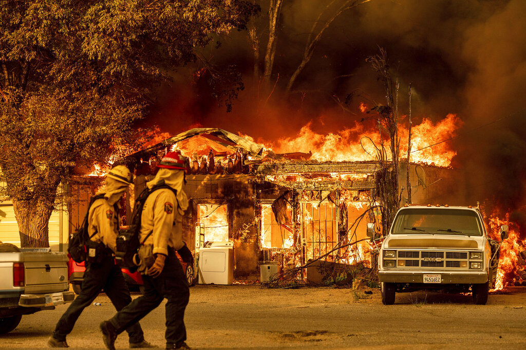 Firefighters pass a burning home as the Sugar Fire, part of the Beckwourth Complex Fire, tears through Doyle, Calif., on Saturday, July 10, 2021. Pushed by heavy winds, the fire came out of the hills and destroyed multiple residences in central Doyle. (AP Photo/Noah Berger)