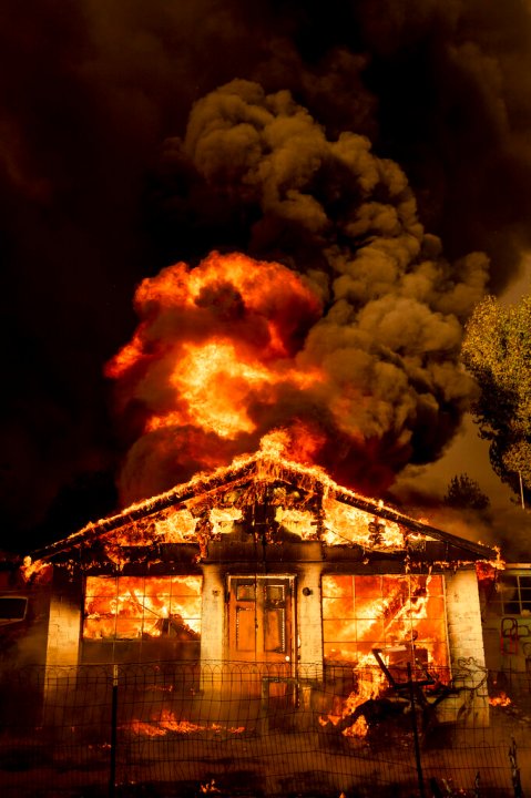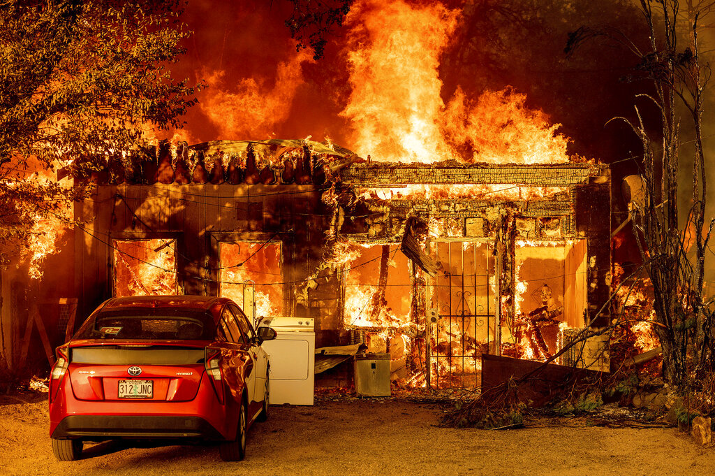 Flames consume a home as the Sugar Fire, part of the Beckwourth Complex Fire, tears through Doyle, Calif., Saturday, July 10, 2021. Pushed by heavy winds amid a heat wave, the fire came out of the hills and destroyed multiple residences in central Doyle. (AP Photo/Noah Berger)