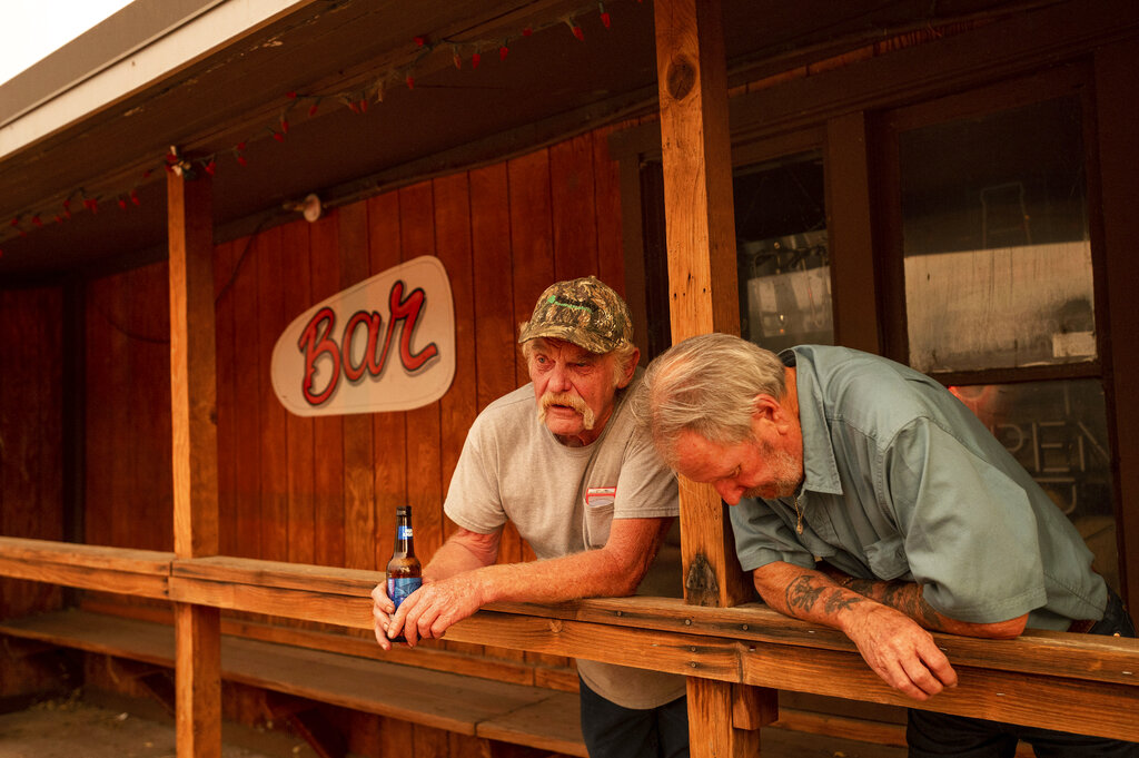 Dave Ferner, left, and Bob Prary watch as multiple homes burn in central Doyle, Calif., as the Sugar Fire, part of the Beckwourth Complex Fire, tears through town on Saturday, July 10, 2021. Ferner said he saved his home using a bulldozer earlier in the day and Prary lost his ranch to a wildfire in November 2020. (AP Photo/Noah Berger)