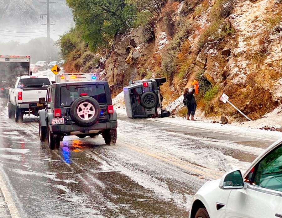 Authorities urged drivers on Sunday to bring their tire chains to the San Gabriel and San Bernardino mountains east of Los Angeles after 10 inches of snow fell in Mount Baldy and up to 18 inches were recorded at the Mountain High ski resort in Wrightwood.