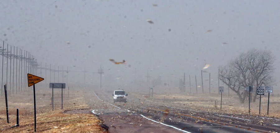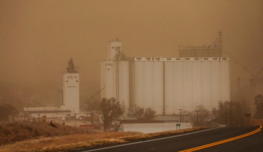 Blowing dust drastically cutting visibility in the Texas Panhandle, where Sherman County Sheriff Ted Allen said all roads in and out of the county were closed. In the Oklahoma Panhandle, the state Department of Transportation reported the main road north from Boise City into Colorado was closed because of collisions and downed power lines.
