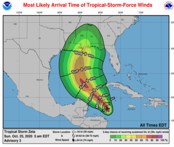Forecasters say the storm is centered about 305 miles south-southeast of the western tip of Cuba on Sunday morning. It is forecast to pass south of western Cuba on Monday, then move into the Gulf of Mexico. Zeta is expected to intensify into a hurricane by Tuesday.