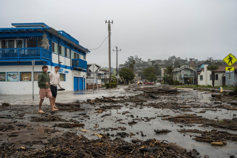 In Aptos on the north end of Monterey Bay, surf overran the beach and swept into a parking lot, leaving the area strewn with debris. Santa Cruz County issued warnings for people in several coastal areas to be ready to evacuate.