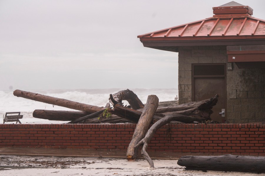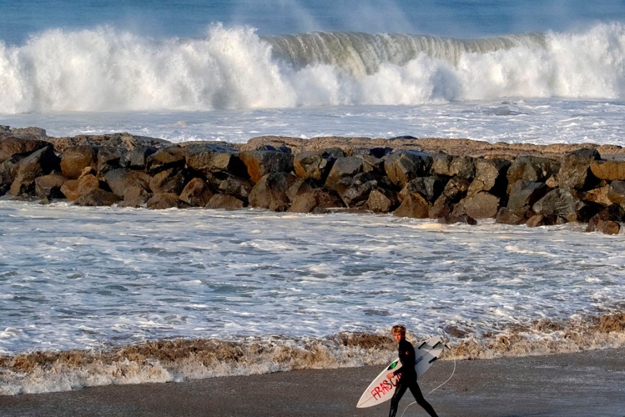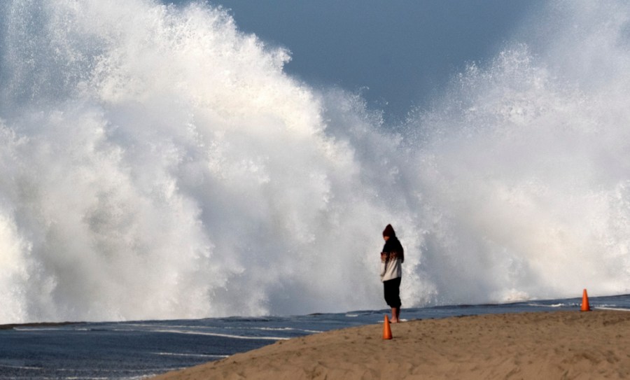 Forecasters urged people to stay off rocks and jetties, and to not turn their backs to the ocean because of the danger of “sneaker waves” — occasional much bigger waves that can run far up the sand and wash someone off a beach.