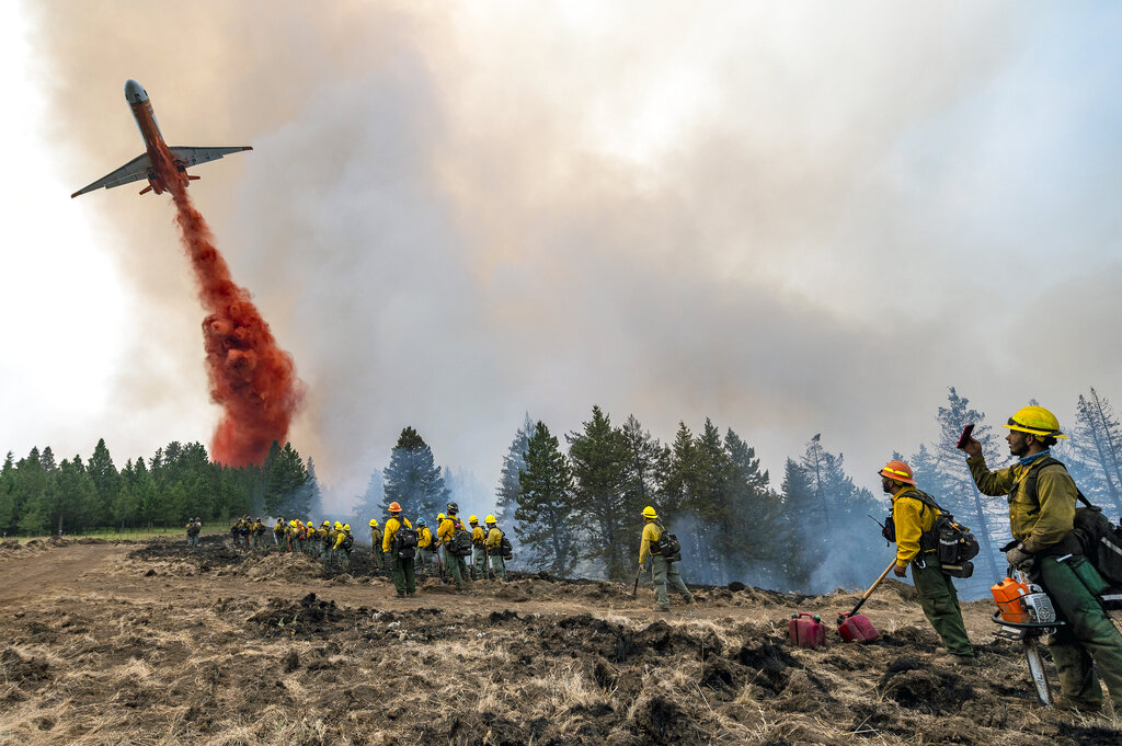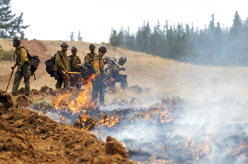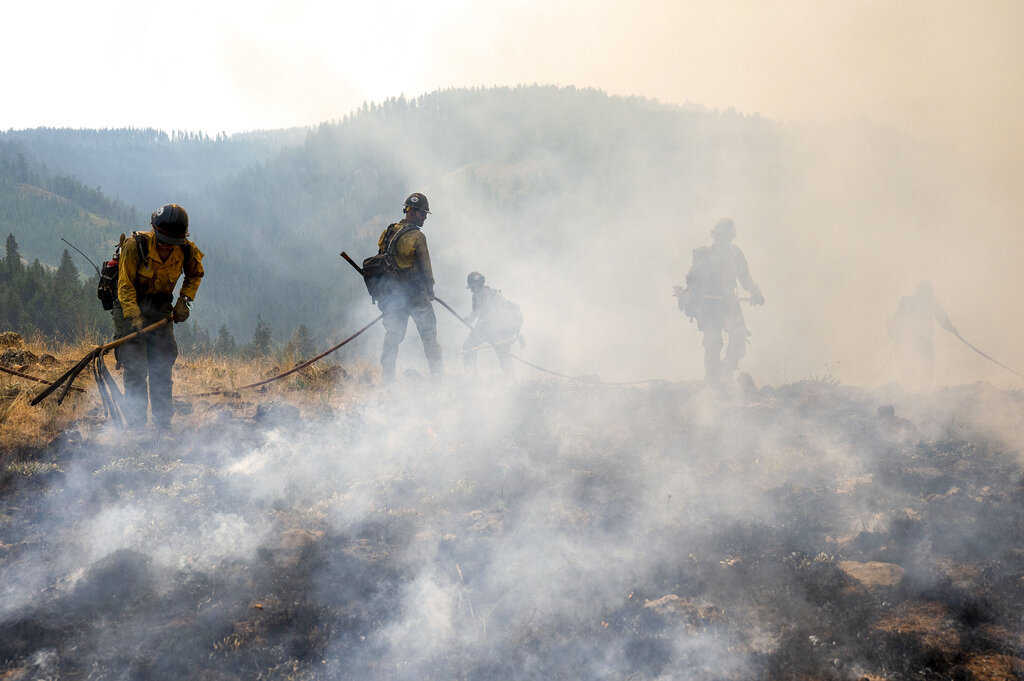 In Idaho, Gov. Brad Little mobilized the National Guard to help fight twin lightning-sparked fires that have together charred nearly 24 square miles (62 square kilometers) of dry timber in the remote, drought-stricken region.