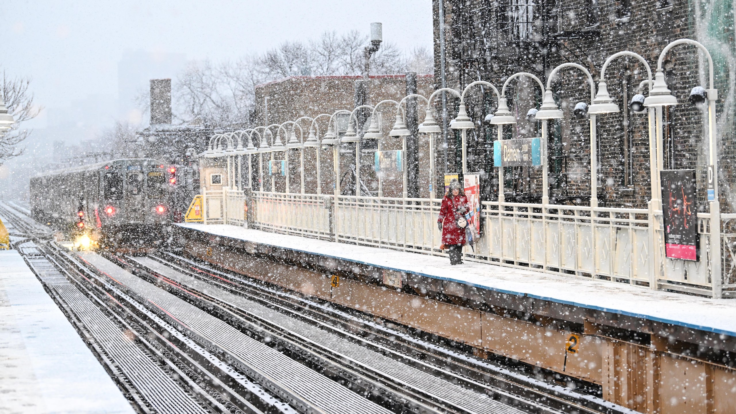 CHICAGO, IL- JANUARY 9: A commuter walks on the platform at the CTA Damen Blue Line station as it snows on Tuesday, January 9, 2024 in Chicago, Illinois. Chicago dodged a snow storm that was forecasted to see 3 to 6 inches of snow but instead received a snowy rain mixture making road conditions slick. (Photo by Joshua Lott/The Washington Post via Getty Images)