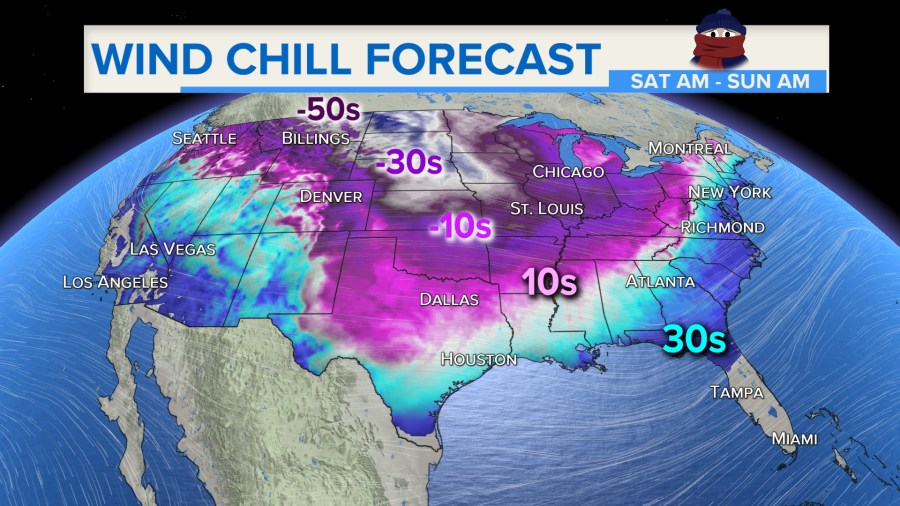 Parts of Texas and the interior Southeast are anticipated to experience wind chills below zero early next week. Over the weekend, wind chills in the Rockies and northern Plains will be below negative 40 degrees.