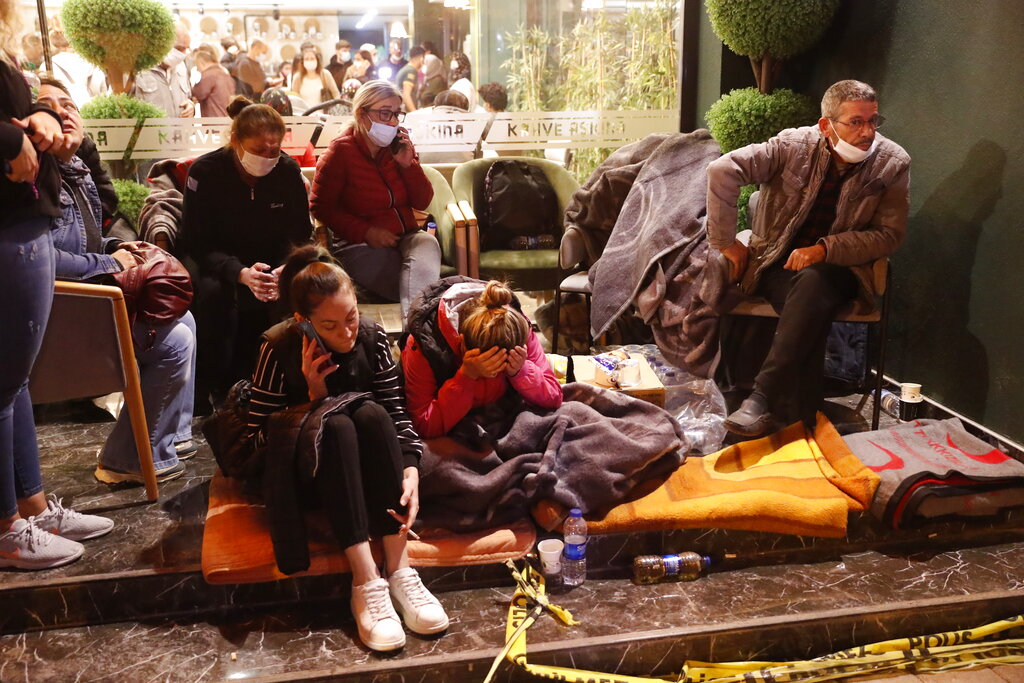 Local residents, staying outdoors for fear of aftershocks, sit in a coffee shop in Izmir, Turkey, Saturday, Oct. 31, 2020. Rescue teams on Saturday ploughed through concrete blocs and debris of eight collapsed buildings in Turkey’s third largest city in search of survivors of a powerful earthquake that struck Turkey’s Aegean coast and north of the Greek island of Samos, killing dozens Hundreds of other were injured. (AP Photo/Darko Bandic)