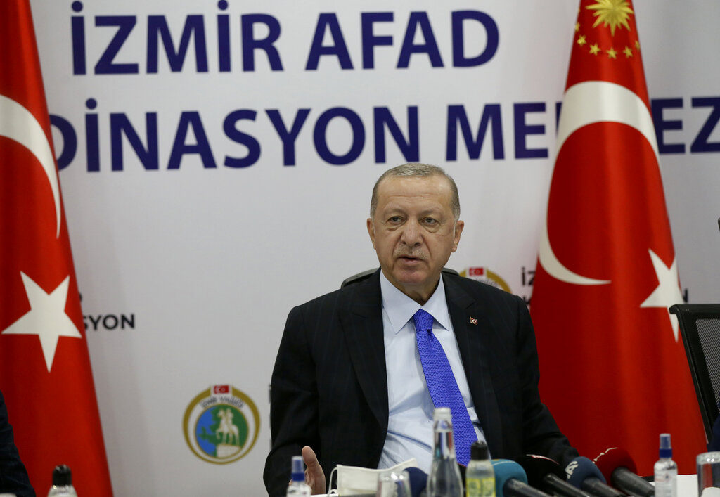 Turkey’s President Recep Tayyip Erdogan speaks at Izmir AFAD emergency response center, in Izmir, Turkey, Saturday, Oct. 31, 2020. Three young children and their mother were rescued alive from the rubble of a collapsed building in western Turkey on Saturday, some 23 hours after a powerful earthquake in the Aegean Sea killed several people and injured more than 800 others.(Turkish Presidency via AP, Pool)