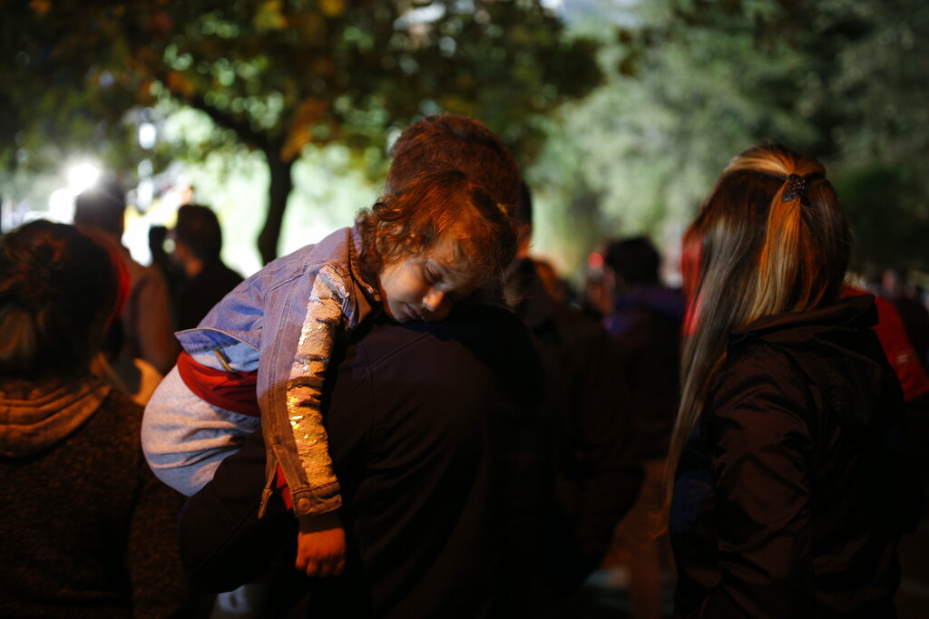 A child sleeps on the shoulder of a relative, as the family stays outdoors for fear of aftershocks, in Izmir, Turkey, Saturday, Oct. 31, 2020. Rescue teams on Saturday ploughed through concrete blocs and debris of eight collapsed buildings in Turkey’s third largest city in search of survivors of a powerful earthquake that struck Turkey’s Aegean coast and north of the Greek island of Samos, killing dozens. Hundreds of others were injured. (AP Photo/Emrah Gurel)
