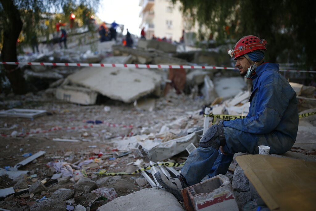 Member of rescue services take a break during search operations in the debris of a collapsed building for survivors in Izmir, Turkey, Sunday, Nov. 1, 2020. Rescue teams continue ploughing through concrete blocs and debris of collapsed buildings in Turkey’s third largest city in search of survivors of a powerful earthquake that struck Turkey’s Aegean coast and north of the Greek island of Samos, Friday Oct. 30, killing dozens Hundreds of others were injured.(AP Photo/Emrah Gurel)