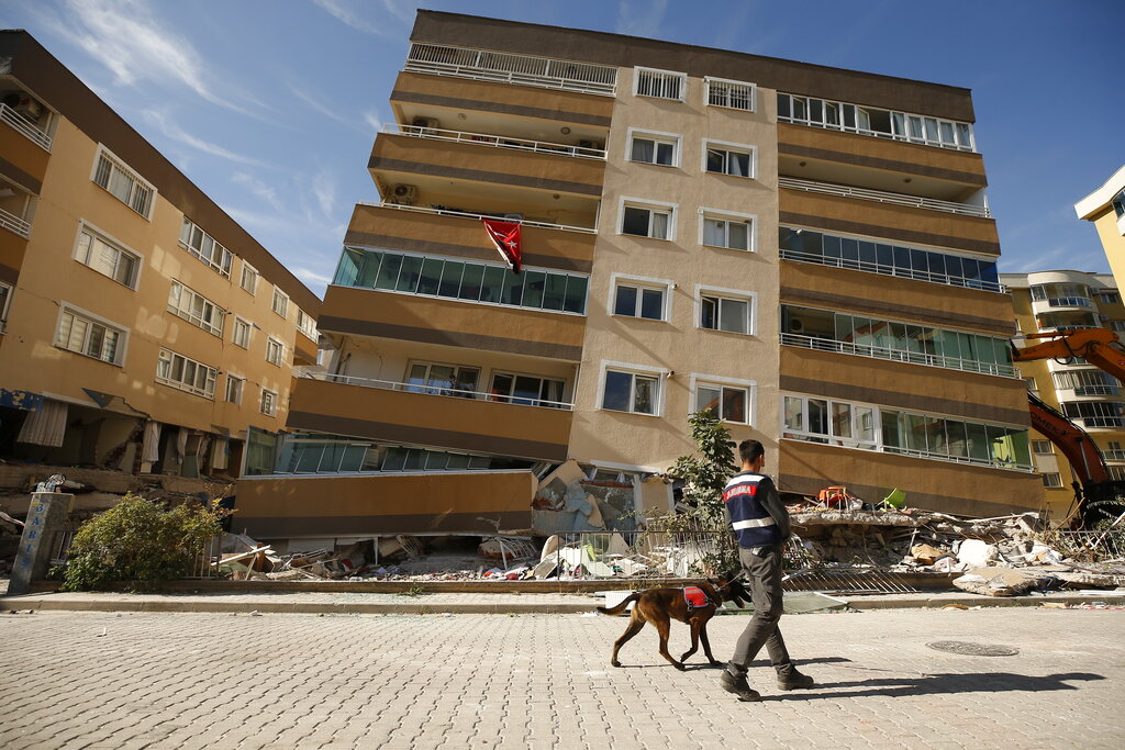 A member of rescue services with a dog, walks past a destroyed building in Izmir, Turkey, Sunday, Nov. 1, 2020. Rescue teams continue ploughing through concrete blocs and debris of collapsed buildings in Turkey’s third largest city in search of survivors of a powerful earthquake that struck Turkey’s Aegean coast and north of the Greek island of Samos, Friday Oct. 30, killing dozens Hundreds of others were injured.(AP Photo/Emrah Gurel)