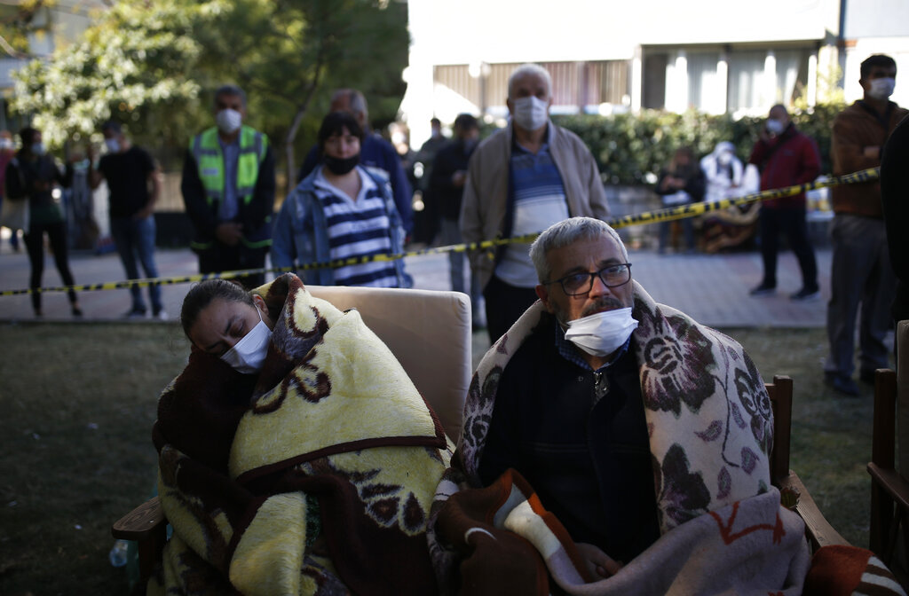 Local residents stay outdoors for fear of strong aftershocks after an earthquake collapsed their houses, in Izmir, Turkey, Sunday, Nov. 1, 2020. The strong earthquake in the Aegean Sea struck Turkey and Greece on Friday. (AP Photo/Ismail Gokmen)