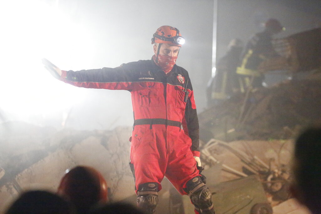 In this photo provided by Turkey’s IHH humanitarian aid group, a member of rescue services, guides others during searching for survivors in the debris of a collapsed building in Izmir, Turkey, early Saturday, Oct. 31, 2020. Rescue teams continue ploughing through concrete blocs and debris of collapsed buildings in Turkey’s third largest city in search of survivors of a powerful earthquake that struck Turkey’s Aegean coast and north of the Greek island of Samos, Friday Oct. 30, killing dozens Hundreds of others were injured. (IHH via AP)