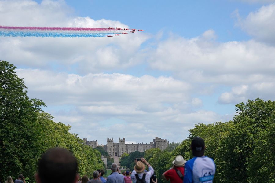 The Red Arrows fly over Windsor Castle, Windsor, England, to mark the official birthday of Queen Elizabeth II, Saturday June 12, 2021. In line with government advice The Queen’s Birthday Parade, also known as Trooping the Colour, will not go ahead in its traditional form. (Andrew Matthews/PA via AP)