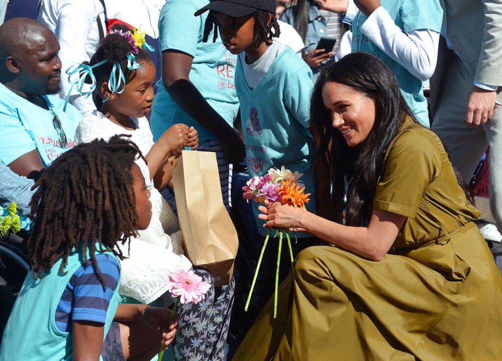 FILE – In this Sept, 24, 2019, file photo, Meghan, the Duchess of Sussex, talks to children during a walkabout in Bo-Kaap, a heritage site, in Cape Town, South Africa. In countries with historic ties to Great Britain, allegations by Prince Harry and Meghan about racism within the royal family have raised questions about whether those nations want to be closely connected to Britain anymore after the couple’s interview with Oprah Winfrey. (Courtney Africa/Pool via AP, File)