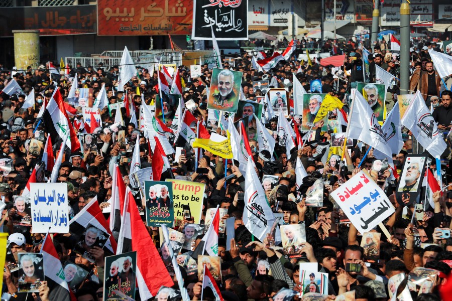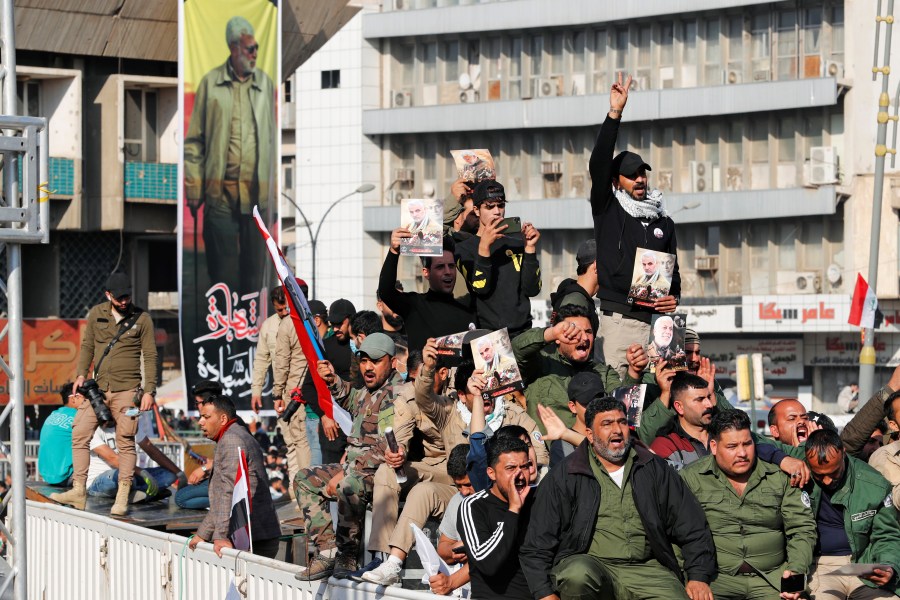BAGHDAD (Reuters) — Tens of thousands of supporters of Iranian-backed Iraqi paramilitary groups chanted anti-American slogans in central Baghdad on Sunday to mark the anniversary of the U.S. killing of Iranian general Qassem Soleimani and an Iraqi militia commander.