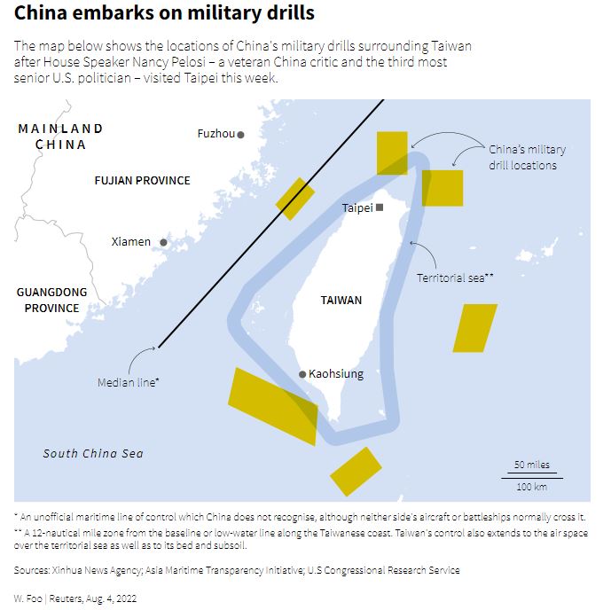 TAIPEI (Reuters) — China fired multiple missiles around Taiwan on Thursday, launching unprecedented military drills a day after a visit by U.S. House of Representatives Speaker Nancy Pelosi to the self-ruled island that Beijing regards as its sovereign territory.