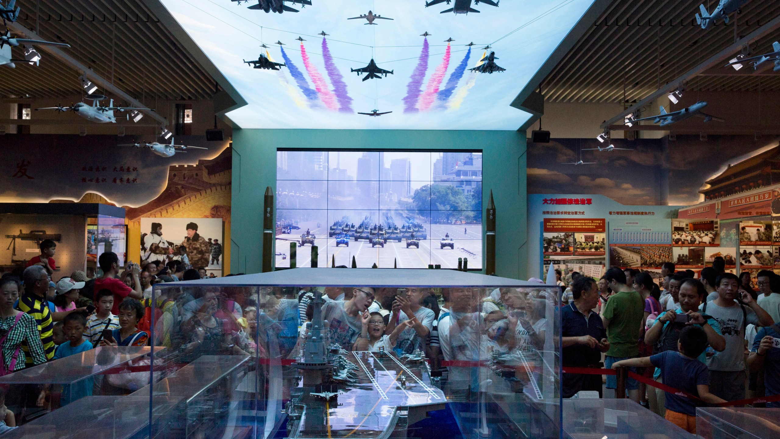 FILE – In this Aug. 1, 2017, file photo, visitors look at a scale model of a Chinese aircraft carrier during an exhibition to mark the 90th anniversary of the founding of the People’s Liberation Army at the military museum in Beijing. China is protesting the alleged incursion of a U.S. Air Force U-2 spy plane into a no-fly zone imposed during live-fire military exercises in the country’s north in a statement issued Tuesday, Aug. 25, 2020. (AP Photo/Ng Han Guan, File)