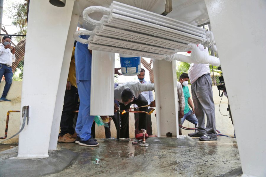 Hospital staff fix a leakage in their oxygen plant in Nashik, in the Indian state of Maharashtra, Wednesday, April 21, 2021. A local administrator in western India says 22 patients have died in a hospital when their oxygen supply was interrupted by a leakage in a supply tank. The official says the oxygen supply has since been resumed to other patients. (AP Photo)