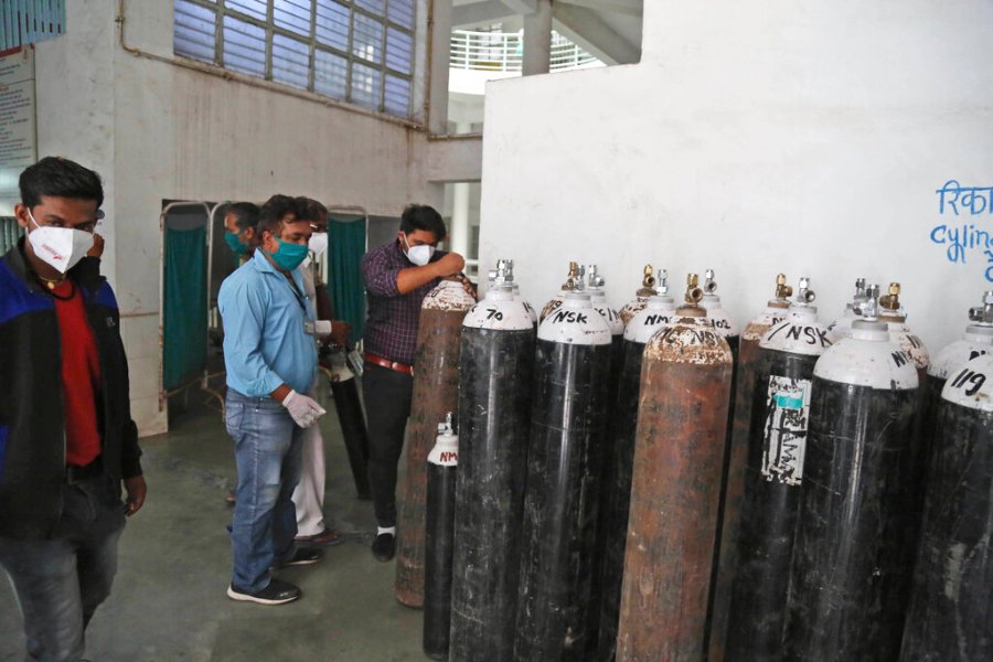 Hospital staff checks oxygen cylinders after a leakage in a oxygen plant in Nashik, in the Indian state of Maharashtra, Wednesday, April 21, 2021. A local administrator in western India says 22 patients have died in a hospital when their oxygen supply was interrupted by a leakage in a supply tank. The official says the oxygen supply has since been resumed to other patients. (AP Photo)