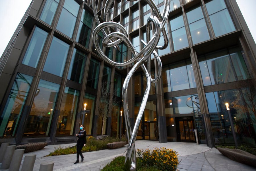 FILE- In this Monday Dec. 1, 2020, file photo the exterior of the European Medicines Agency is seen in Amsterdam, Netherlands. The European Commission defended its coronavirus vaccination strategy Monday amid growing criticism in member states about the slow rollout of COVID-19 shots across the region with 450 million inhabitants. (AP Photo/Peter Dejong, File)