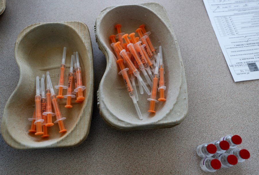 FILE – In this file photo dated Friday, Feb. 5, 2021, Vials of the AstraZeneca vaccine and loaded syringes wait to be administered to homeless persons at the Welcome Centre in Ilford, east London. The World Health Organization Monday Feb. 15, 2021, granted an emergency authorization to the coronavirus vaccine made by AstraZeneca, a move that should allow its partners to ship millions of doses to countries worldwide as part of a U.N.-backed program to stop the pandemic.(AP Photo/Frank Augstein, FILE)