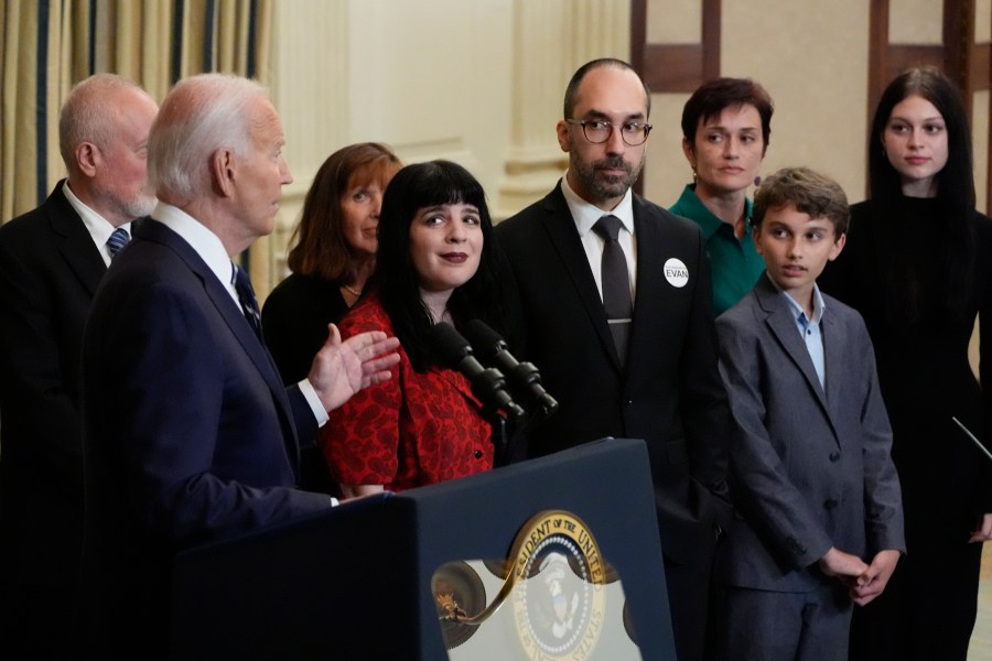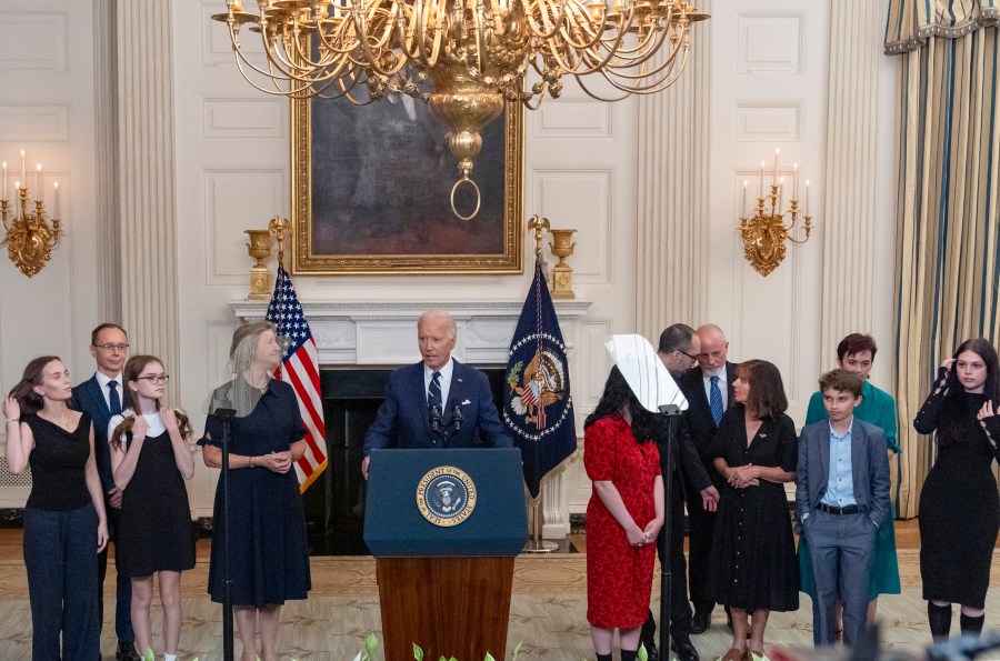 President Joe Biden delivers remarks on a prisoner swap with Russia from the State Dining Room of the White House, Thursday, Aug. 1, 2024, in Washington, as the family of hostage Evan Gershkovich, looks on. (AP Photo/Alex Brandon)