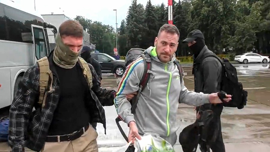 In this image made from video provided by Russian Federal Security Service via RTR on Thursday, Aug. 1, 2024, Germanys Rico Krieger, center, and a Russian Federal Security Service agent, left, leave a bus as they arrive at an airport outside Moscow, Russia. (Russian Federal Security Service/RTR via AP)