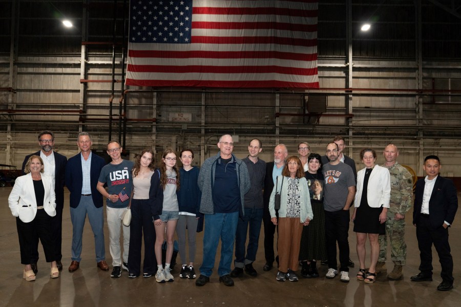 Former prisoners released by Russia, Evan Gershkovich (C), former US marine Paul Whelan (9thL), and journalist US-Russian Alsu Kurmasheva (7thL) pose after landing at Joint Base San Antonio-Kelly Field, Texas, on August 2, 2024. Journalist Evan Gershkovich and fellow prisoners released by Russia landed in the United States late August 1, as part of an extraordinary swap deal struck between Washington and Moscow. A plane carrying Gershkovich, former US marine Paul Whelan, and journalist Alsu Kurmasheva landed at around 11:40 pm (0340 GMT) at Joint Base Andrews near Washington, where President Joe Biden and Vice President Kamala Harris were waiting to greet them. (Photo by SUZANNE CORDEIRO / AFP) (Photo by SUZANNE CORDEIRO/AFP via Getty Images)