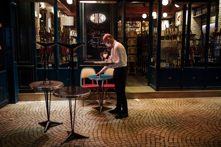 A waiter checks the final revenue as he closes a bar terrace in Paris, Saturday, Oct. 17, 2020. French restaurants, cinemas and theaters are trying to figure out how to survive a new curfew aimed at stemming the flow of record new coronavirus infections. The monthlong curfew came into effect Friday at midnight, and France is deploying 12,000 extra police to enforce it. (AP Photo/Lewis Joly)