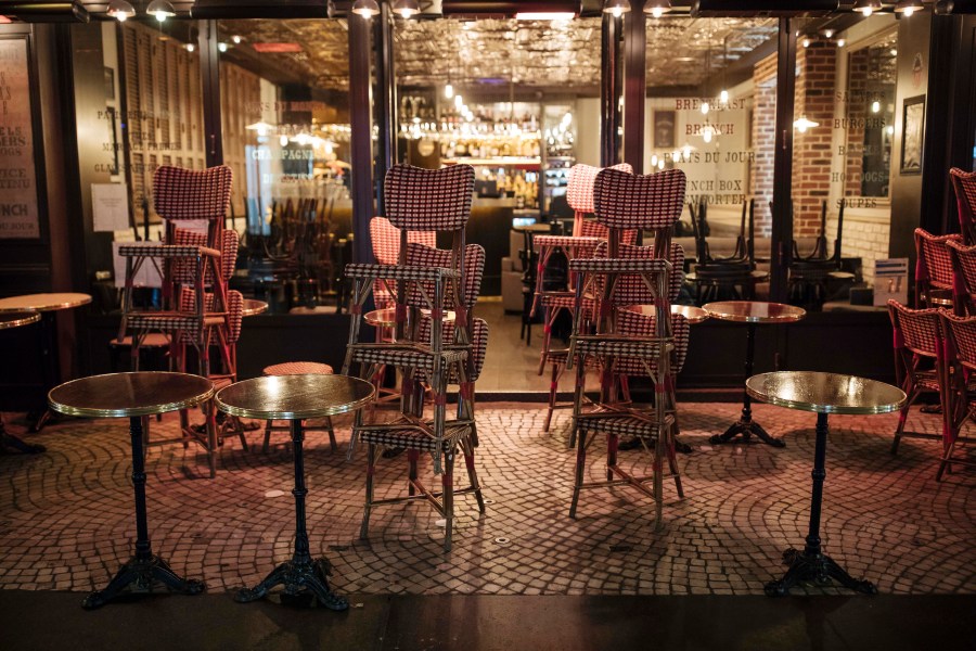 A bar terrace is closed to meet the curfew in Paris, Saturday Oct. 17, 2020. French restaurants, cinemas and theaters are trying to figure out how to survive a new curfew aimed at stemming the flow of record new coronavirus infections. The monthlong curfew came into effect Friday at midnight, and France is deploying 12,000 extra police to enforce it. (AP Photo/Lewis Joly)