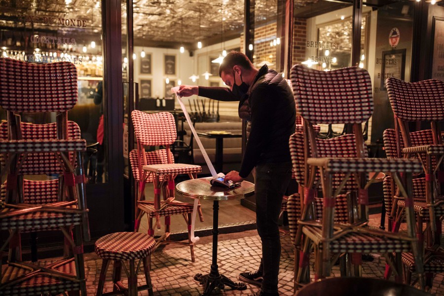 A waiter closes a bar terrace in Paris, Saturday Oct. 17, 2020. French restaurants, cinemas and theaters are trying to figure out how to survive a new curfew aimed at stemming the flow of record new coronavirus infections. The monthlong curfew came into effect Friday at midnight, and France is deploying 12,000 extra police to enforce it. (AP Photo/Lewis Joly)
