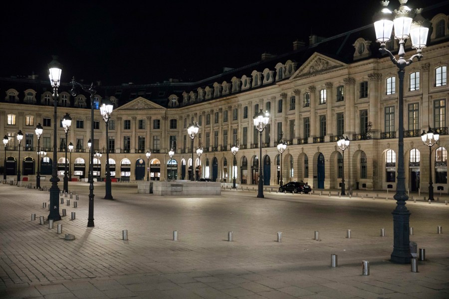 Vendome square is empty during curfew in Paris, Saturday, Oct. 17, 2020. French restaurants, cinemas and theaters are trying to figure out how to survive a new curfew aimed at stemming the flow of record new coronavirus infections. The monthlong curfew came into effect Friday at midnight, and France is deploying 12,000 extra police to enforce it. (AP Photo/Lewis Joly)