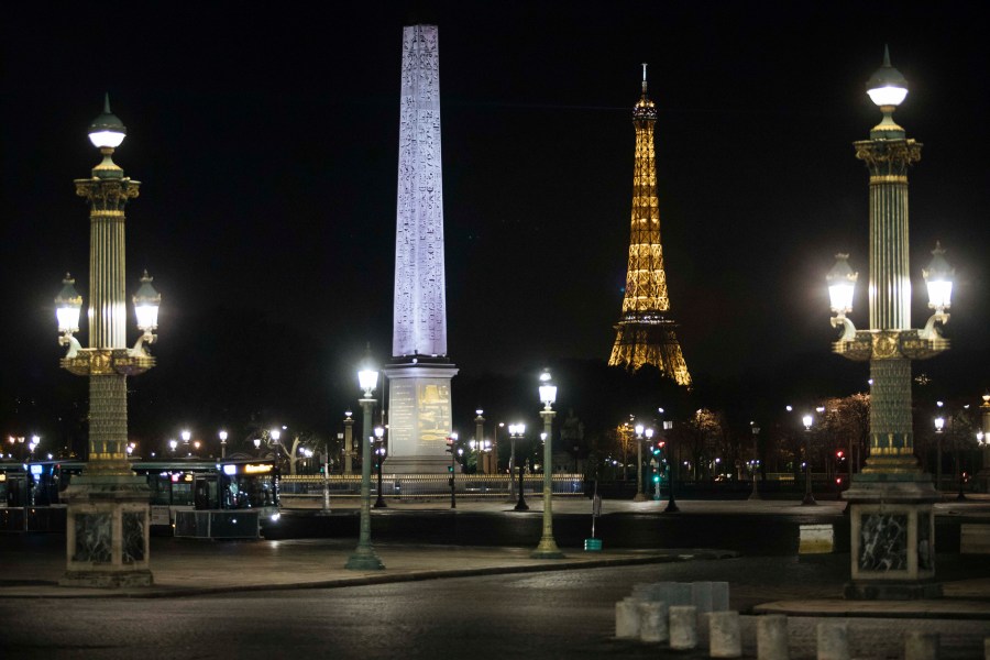 Concorde square is empty during curfew in Paris, Saturday, Oct. 17, 2020. French restaurants, cinemas and theaters are trying to figure out how to survive a new curfew aimed at stemming the flow of record new coronavirus infections. The monthlong curfew came into effect Friday at midnight, and France is deploying 12,000 extra police to enforce it. (AP Photo/Lewis Joly)